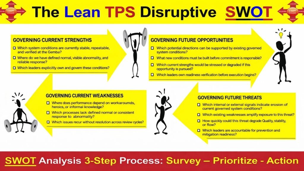 Lean TPS Disruptive SWOT prevents this failure by embedding strategic direction within the same governance discipline that Lean TPS applies to daily work. Conditions are defined. Abnormality is detected. Ownership is clear. Response is required. Cadence ensures learning and renewal. Leadership discretion is constrained by obligation rather than replaced by rules.